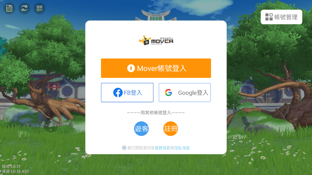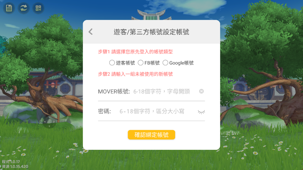 通過遊客帳號(Guest)、FB、Google、Apple ID等帳號登入遊戲的玩家,可以進行Mover帳號的設定,設定後可隨時使用Mover帳號代替遊客等方式進行登入遊戲。